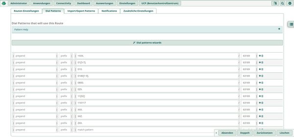 0 wählen, um eine Amtsleitung zu bekommen – das System löscht diese 0 und sendet nur die eigentliche Nummer nach draußen.Optional kann man noch ein CallerID-Feld angeben, um Dialpatterns nur auf bestimmte interne Teilnehmer oder Gruppen anzuwenden. So lässt sich z. B. konfigurieren, dass nur bestimmte Durchwahlen Auslandsgespräche führen dürfen.