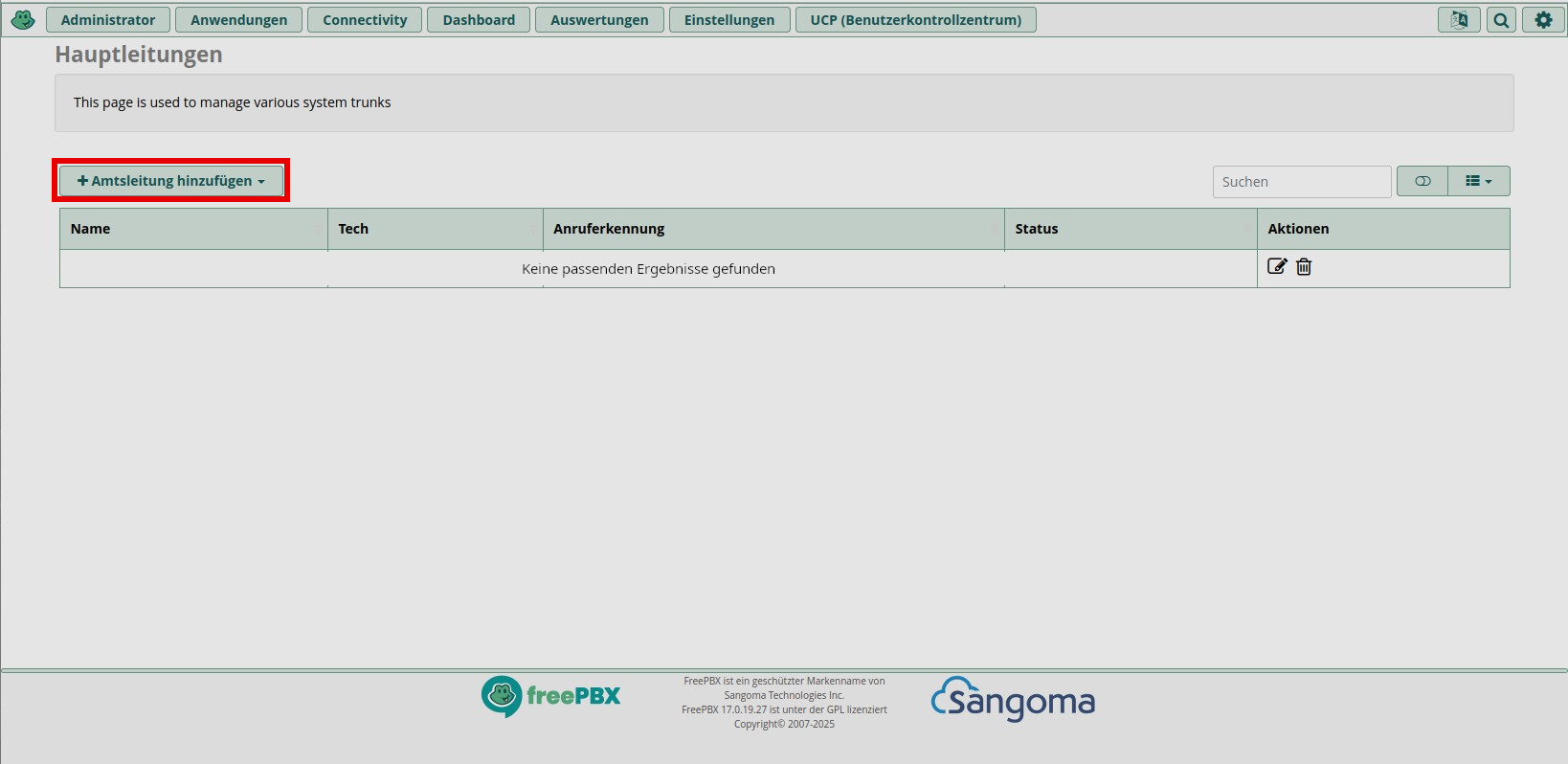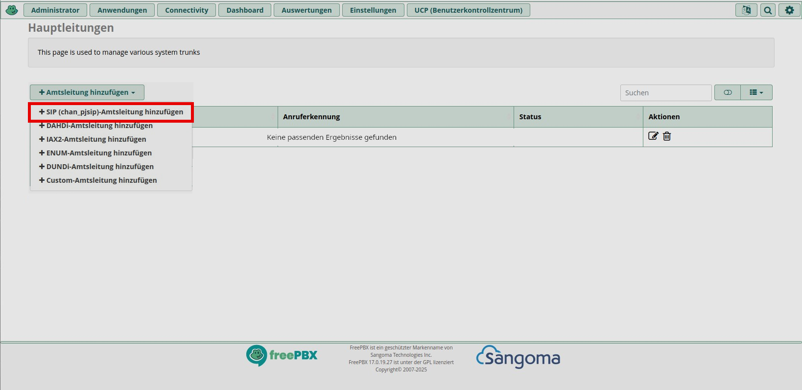 Die SIP-Trunks werden unter “Connectivity => Hauptleitungen” (IP-Adresse/admin/config.php?display=trunks) konfiguriert. Auf dieser Seite wird über das Dropdown-Menü “Amtsleitung hinzufügen” das Menü “+ SIP (chan_pjsip)-Amtsleitung hinzufügen” ausgewählt.