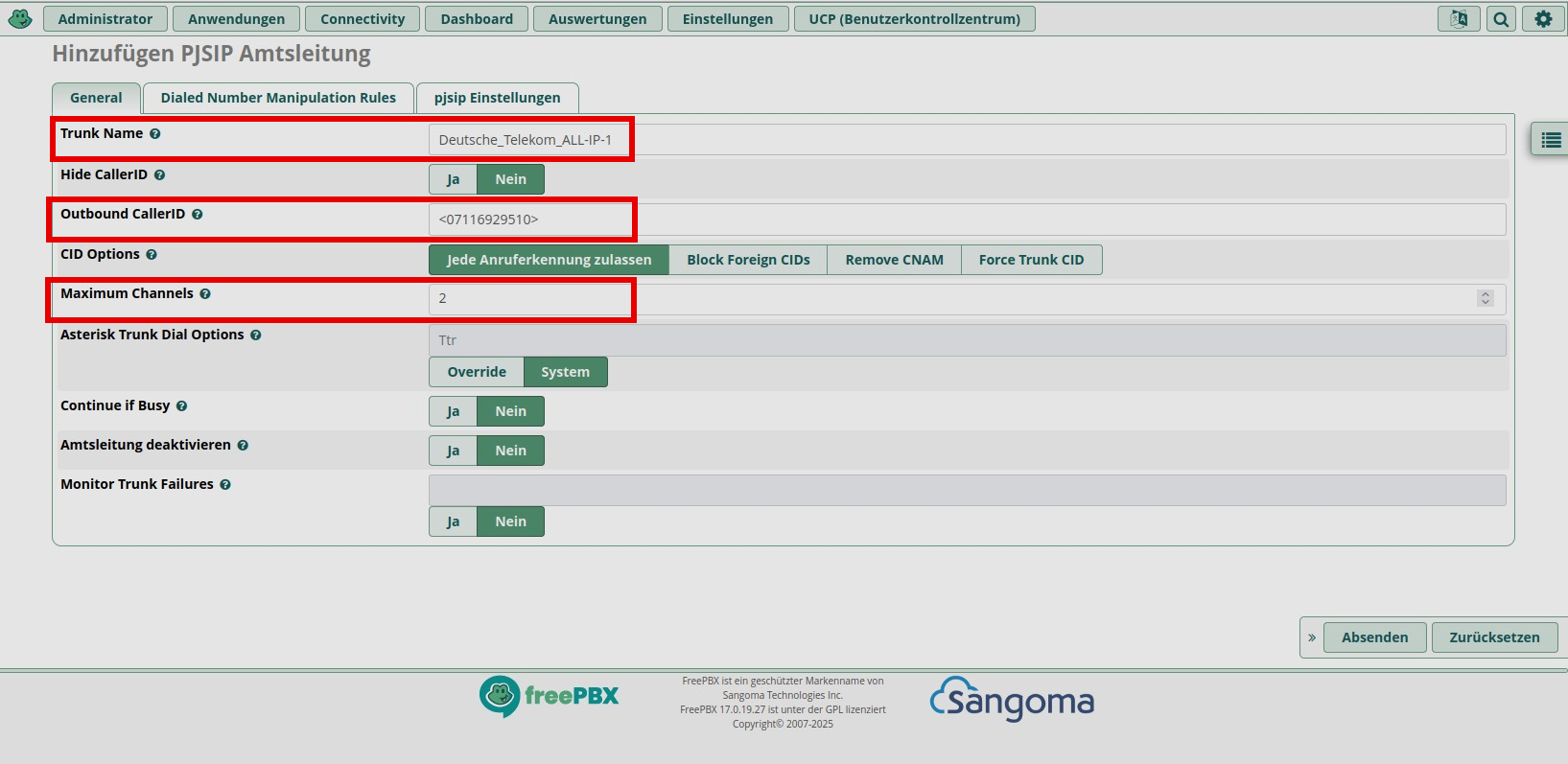 Unter Outbound CallerID kommt die entsprechende Rufnummer rein und zwar zum Einen in spitze Klammern und zum Anderen mit der Vorwahl inklusive der “0” anstelle von der Ländervorwahl “+49”. Das ist wichtig für die interne Verarbeitung. Maximum Channels beinhaltet die Anzahl der Kanäle, zumindest bei der Telekom sind das zwei. Alle anderen Einstellungen können aus den angebotenen Default-Werten übernommen werden.
