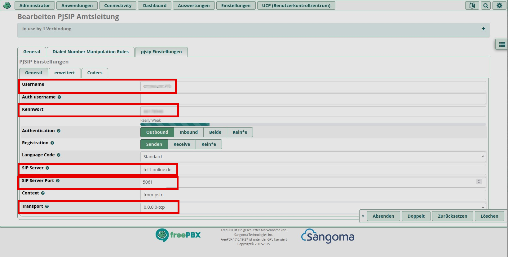 Bei SIP Server wird der Server eingetragen. Das können bei der Telekom je nach Tarif unterschiedliche Server sein (tel.t-online.de, sip-trunk.telekom.de etc.). Das sollte man in Erfahrung bringen. Und SIP Server Port muss zumindest bei sip-trunk.telekom.de der Telekom den Port “5061” enthalten, genauso wie Transport auf “0.0.0.0-tcp” stehen sollte, da ansonsten die Registrierung nicht funktioniert.
