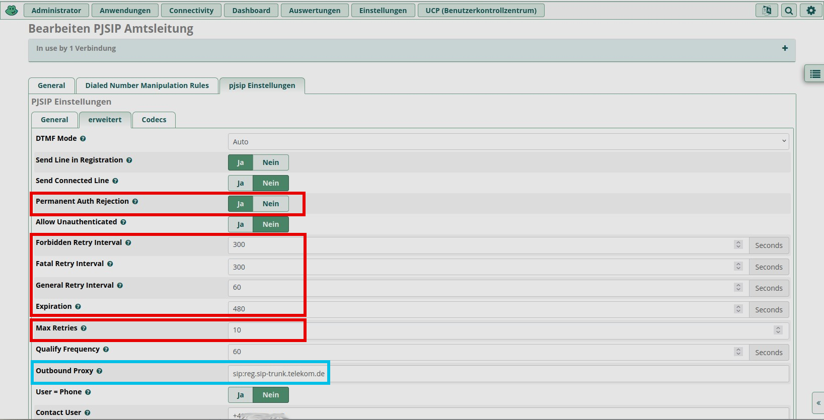 In FreePBX/Asterisk, bezieht sich die Option "Permanent Auth Rejection" bei den SIP-Trunks auf das Verhalten beim Umgang mit fehlgeschlagenen Authentifizierungsversuchen. Wenn sich ein Trunk eines SIP-Providers oder einer Gegenstelle mit falschen Anmeldedaten authentifizieren will, wird diese Gegenstelle dauerhaft abgelehnt, auch wenn sie sich später mit korrekten Daten meldet. Deshalb ist dieser Wert auf “Ja” zu setzen.
