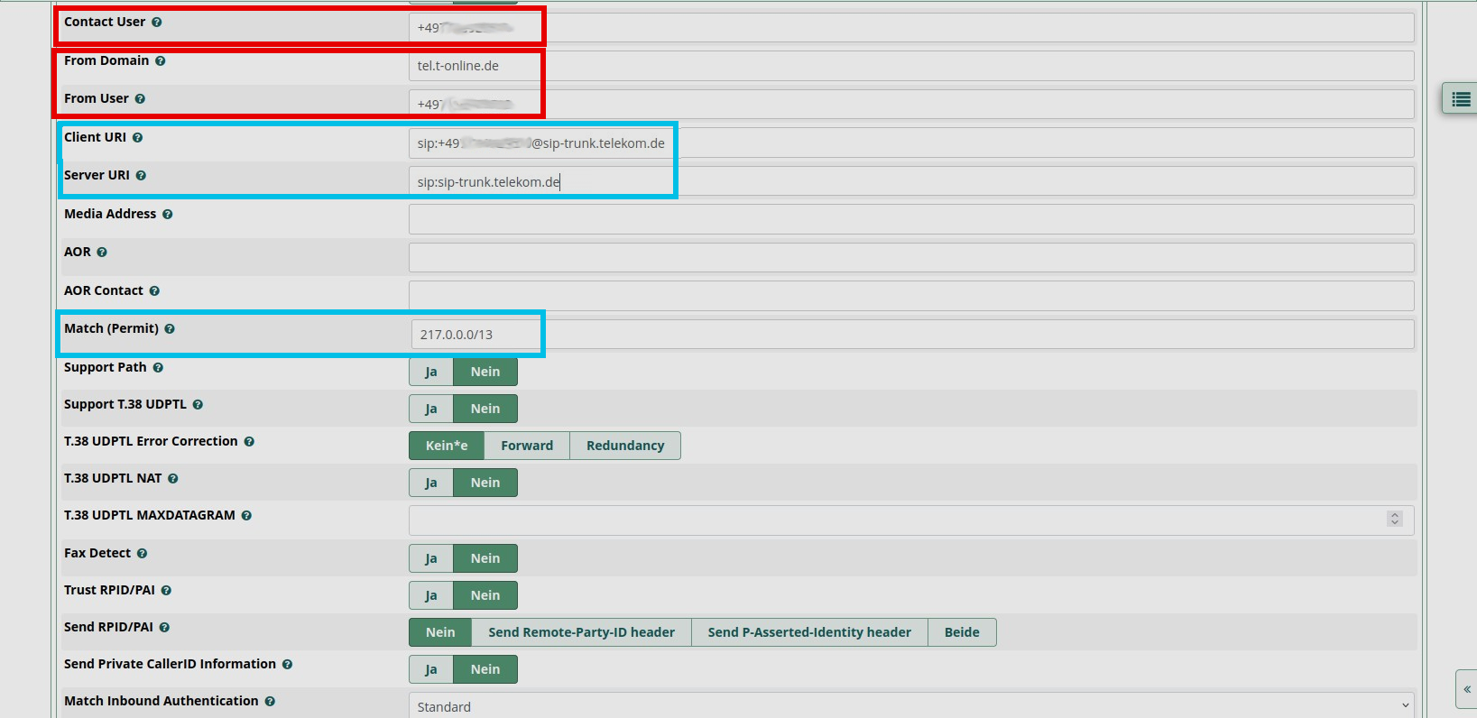 Bei Nutzung des Tarifs mit Sip-Trunk bei der Telekom werden zusätzlich die Parameter "Client URI" mit “sip:+49Rufnummer@sip-trunk.telekom.de”, "Server URI" mit “sip:sip-trunk.telekom.de” und ”Match (Permit)" mit “217.0.0.0/13” befüllt.