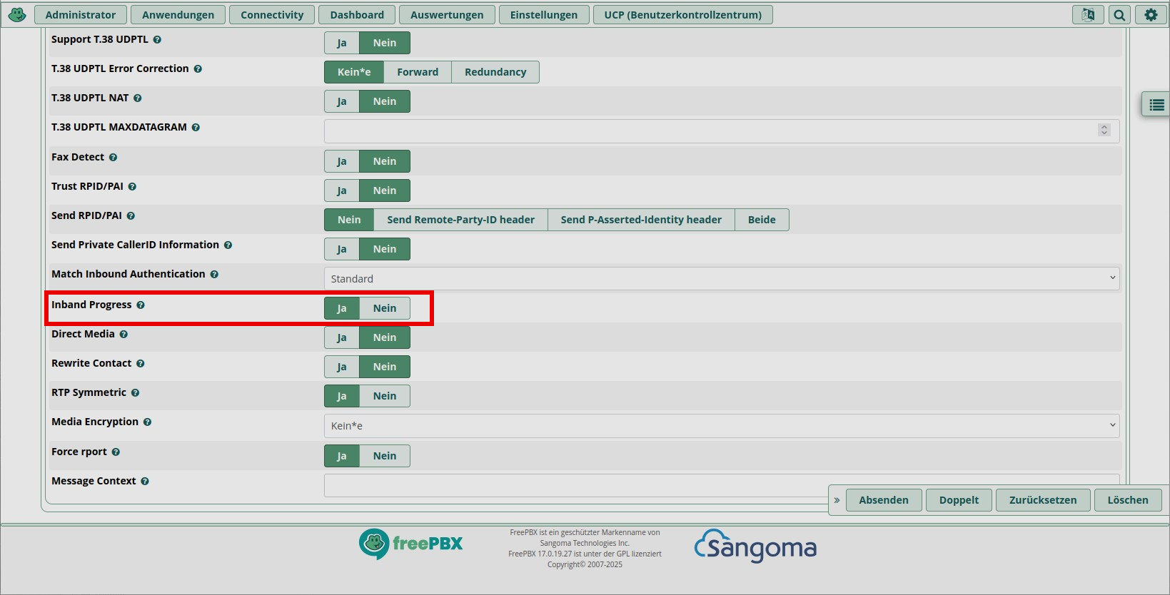 Die Option „Inband Progress“ mit “Ja” steuert, wie früh Asterisk Audio vom Provider (Trunk) an den Anrufer weiterleitet – insbesondere Rufzeichen (Ringback), Ansagen oder Fehler-Meldungen. Asterisk leitet Audio (z. B. Ansagen oder Klingeltöne) weiter, auch wenn der Anruf noch nicht offiziell angenommen wurde (200 OK). Das ist wichtig, wenn der Provider keinen 180 Ringing oder 183 Session Progress mit SDP korrekt sendet – also stattdessen einfach direkt Töne oder Ansagen streamt.