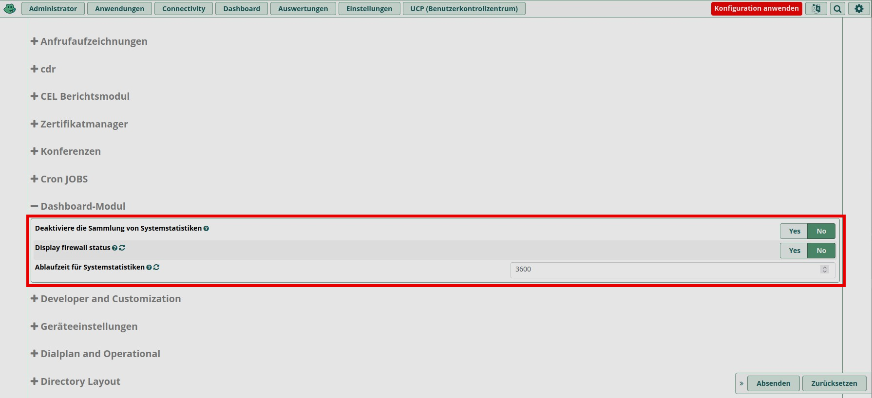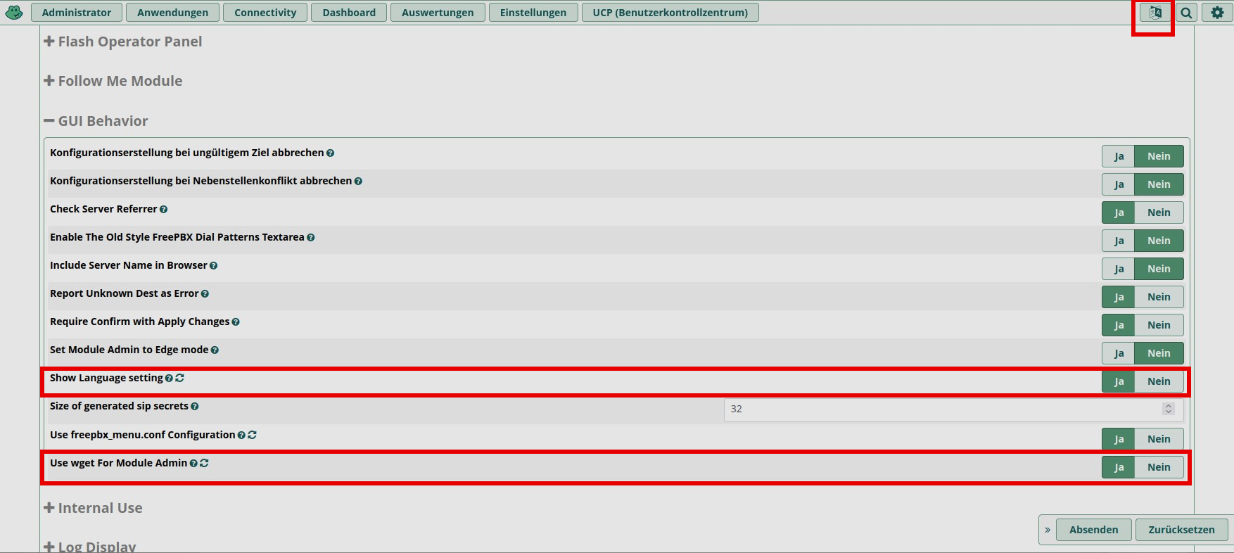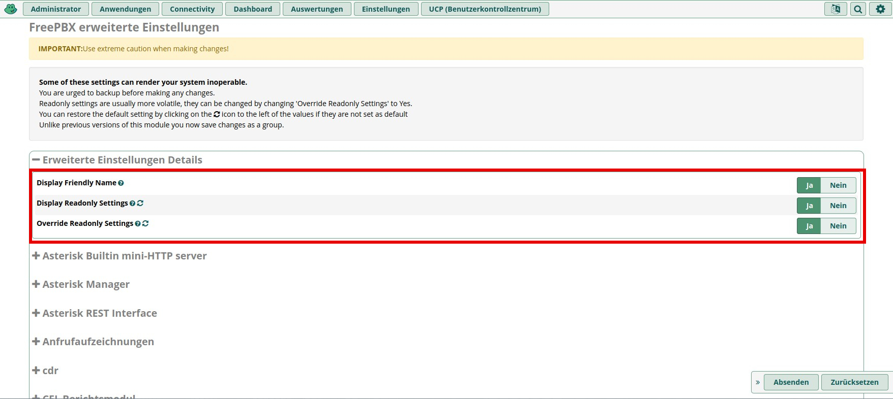 Basic settings must first be configured under "Advanced Settings" (http://IP-Adresse/admin/config.php?display=advancedsettings). These sections are located here.