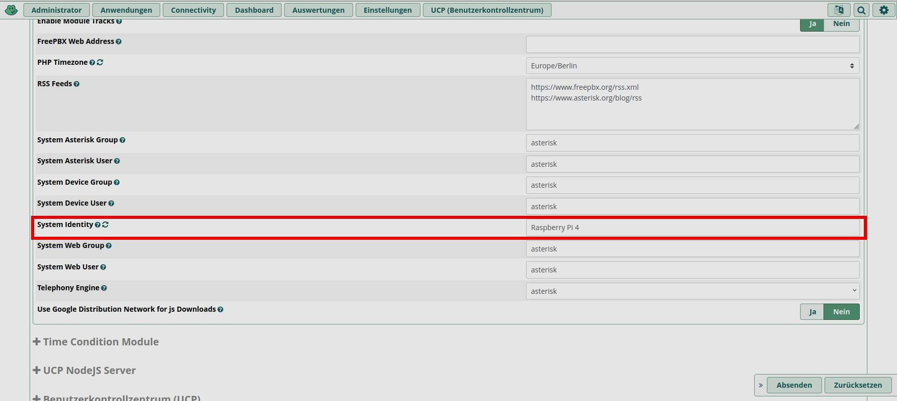 "Authorization Type" should be set to User Manager, as this ensures that all user accounts are managed consistently in the User Manager. "Default Language" expects the value "de_DE" for Germany, and "PHP Timezone" expects the value "Europe/Berlin". The name of the FreePBX telephone system can be freely selected in "System Identity".