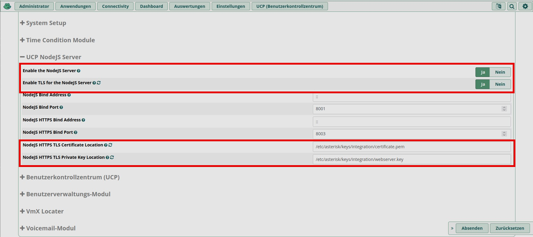 | User Control Center (UCP) | If users should have access to the web interface (voicemail, fax, etc.) | Check configuration, e.g., activate NodeJS |
