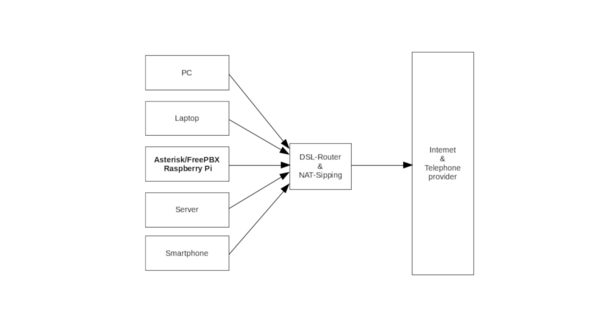 At this point, it should be emphasized again that the FreePBX or Asterisk telephone system—like any other device on the local network—is a network-capable computer and behaves accordingly. As shown in the diagram, all devices, including the FreePBX system, access the Internet via the DSL router or firewall. The telephone system also uses this route, for example, to register with the telephony provider's SIP trunk.