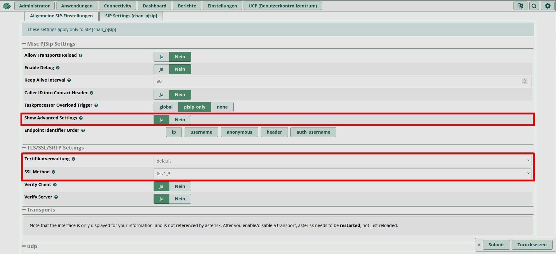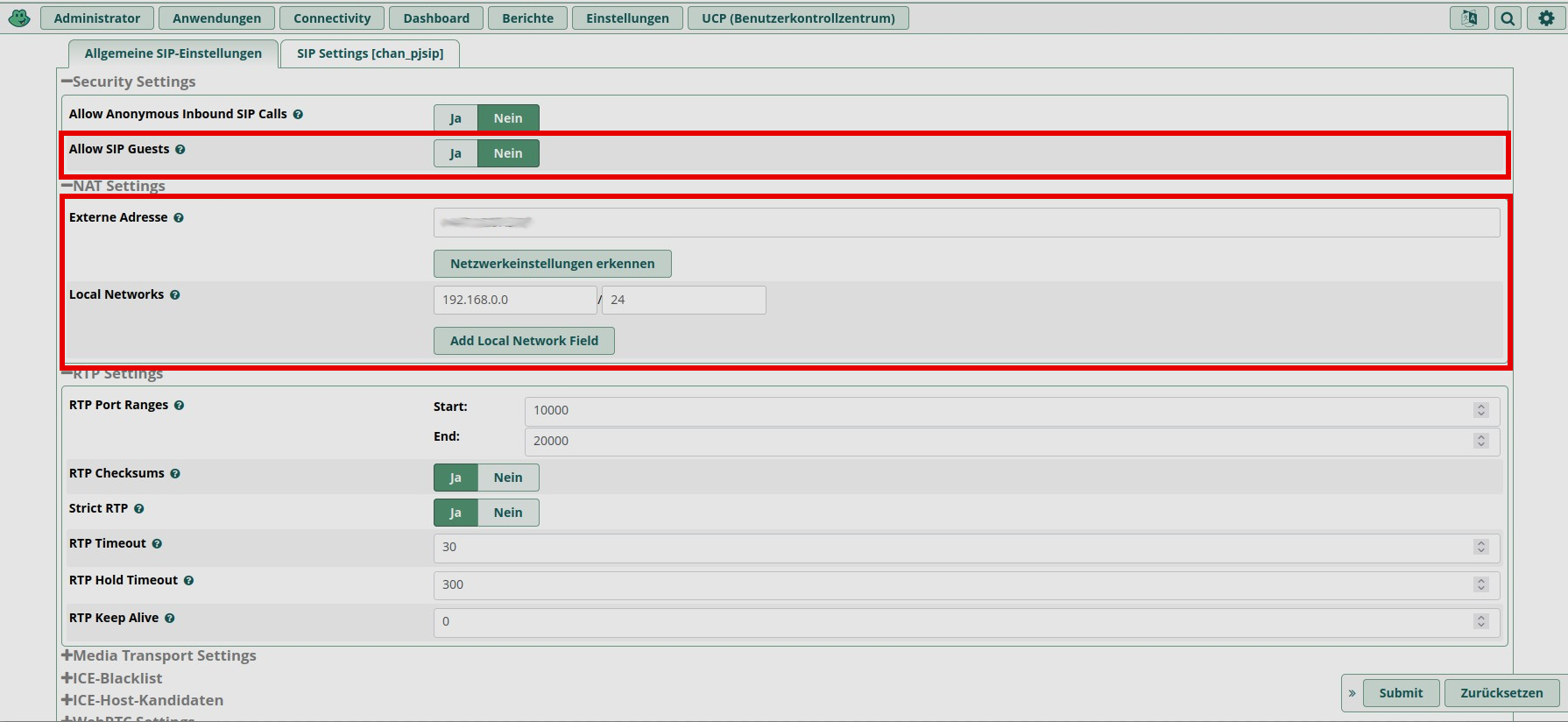 The SIP settings are located under "Settings → Asterisk SIP Settings" (http://IP-Adresse/admin/config.php?display=sipsettings). Important settings can be configured under the "General SIP Settings" and "SIP Settings [chan_pjsip]" tabs.