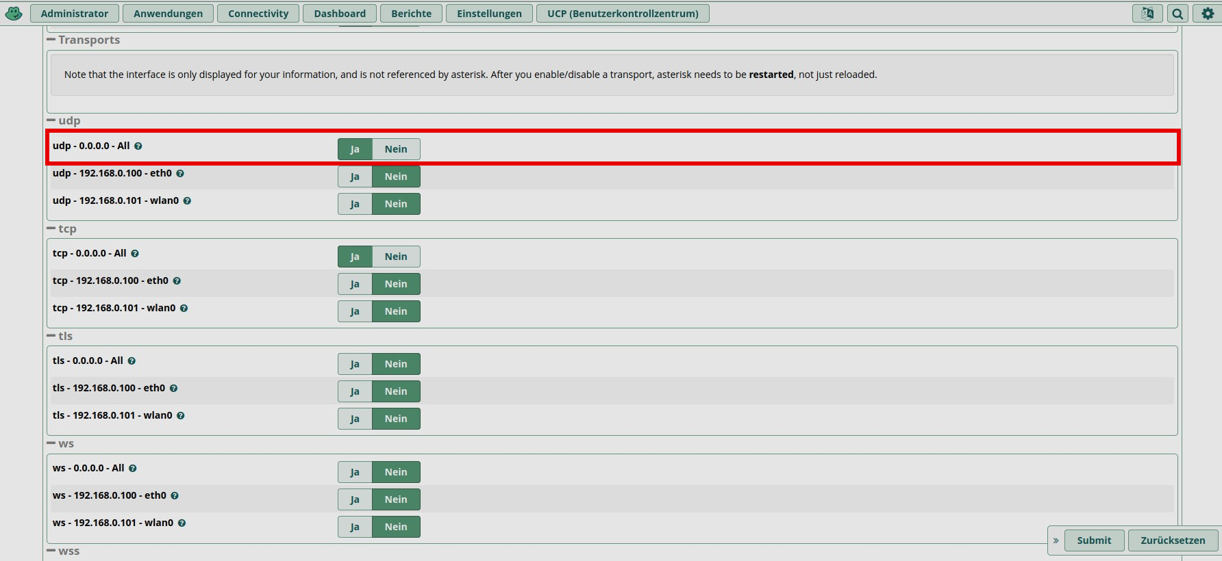 Finally, the value for "udp - 0.0.0.0 - All" must be set to "Yes", saved, and then reloaded to make the final settings. Under "Port to Listen On", you'll find two port specifications, one for UDP and one for TCP. UDP listens on "5060", while TCP listens on port "5061". This is important for Telekom, because when DSL is encrypted, Telekom requires port “5061”.