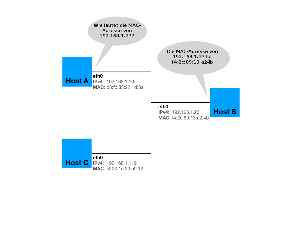 Das Address Resolution Protocol (ARP) wird verwendet, um eine herstellerabhängige MAC-Adresse (Hardware-Adresse) in eine IPv4-Adresse zu übersetzen. Während die Hardware-Adresse rein theoretisch nur einmal weltweit existiert und nur schwer handelbar sind, werden IPv4-Adressen in der INNA (Internet Assigned Numbers Authority) vergeben und sind begrenzt. So wird die Kommunikation auf Layer-2 möglich (z. B. Ethernet und WiFi). Wenn ein Quellhost ein IPv4-Paket an einen Zielhost in dem selben Subnetz senden muss, führt er eine ARP-Anforderung zum Abrufen der MAC-Adresse des Zielhosts aus. Der Quellhost sendet eine ARP-Anfrage an die Ethernet-Broadcast-Adresse ff: ff: ff: ff: ff: ff. Alle Hosts im Subnetz empfangen die ARP-Anforderung, die gesendet wurde, aber nur der Zielhost antwortet auf die ARP-Anforderung mit der MAC-Adresse, die der IPv4-Adresse zugeordnet ist.